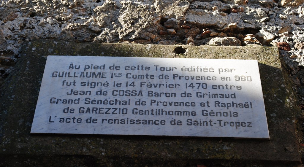Non puรฒ mancare una tappa ai piedi della torre edificata da Guglielmo I, conte di Provenza, perchรฉ รจ qui che si trova la targa a ricordo di quel famoso 14 febbraio 1470 in cui venne ufficializzato lโatto di rinascita di Saint-Tropez.